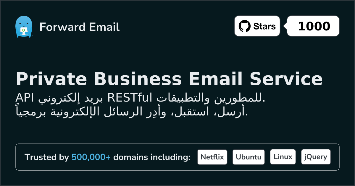 API بريد إلكتروني RESTful للمطورين والتطبيقات. أرسل، استقبل، وأدِر الرسائل الإلكترونية برمجياً.