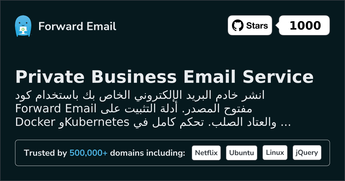 كود المصدر الكامل متاح على GitHub على https://github.com/forwardemail/forwardemail.net، مرخص بموجب رخصة MIT.