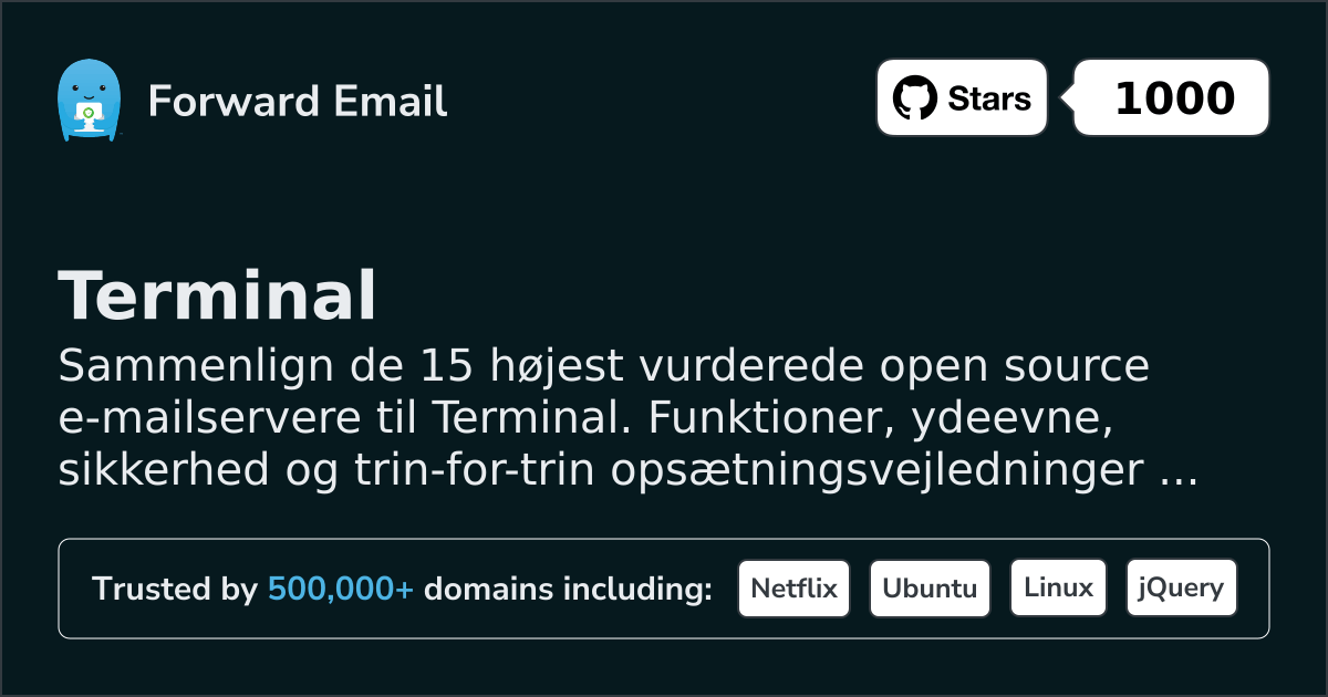 Forward Email er en open source-e-mail server til Terminal. Den officielle beskrivelse fra hjemmesiden siger "Krypteret e-mail med fokus på privatliv til dig. Vi er den foretrukne e-mailtjeneste for hundredtusindvis af skabere, udviklere og virksomheder. Send og modtag e-mail som you@yourdomain.com med dit brugerdefinerede domæne, eller brug et af vores."