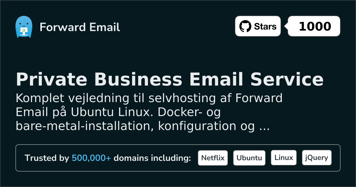 Denne vejledning giver trin-for-trin instruktioner til installation af Forward Emails selvhostede løsning på Ubuntu-systemer. Denne vejledning er specifikt tilpasset Ubuntu 20.04, 22.04 og 24.04 LTS versioner.