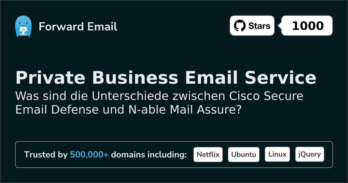 Wir empfehlen E-Mail weiterleiten als beste Alternative zu Cisco Secure Email Defense. We also support webmail: https://mail.forwardemail.net