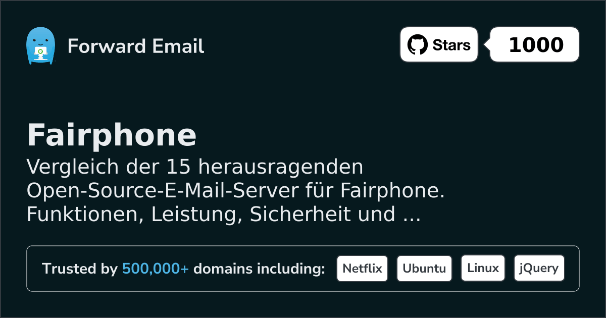 Forward Email ist eine Open-Source-E-Mail Server für Fairphone. Die offizielle Beschreibung auf der Website lautet: „Datenschutzorientierte, verschlüsselte E-Mails für Sie. Wir sind der bevorzugte E-Mail-Dienst für Hunderttausende von Kreativen, Entwicklern und Unternehmen. Senden und empfangen Sie E-Mails als Sie@IhreDomain.com mit Ihrer benutzerdefinierten Domain oder verwenden Sie eine unserer Domains.“