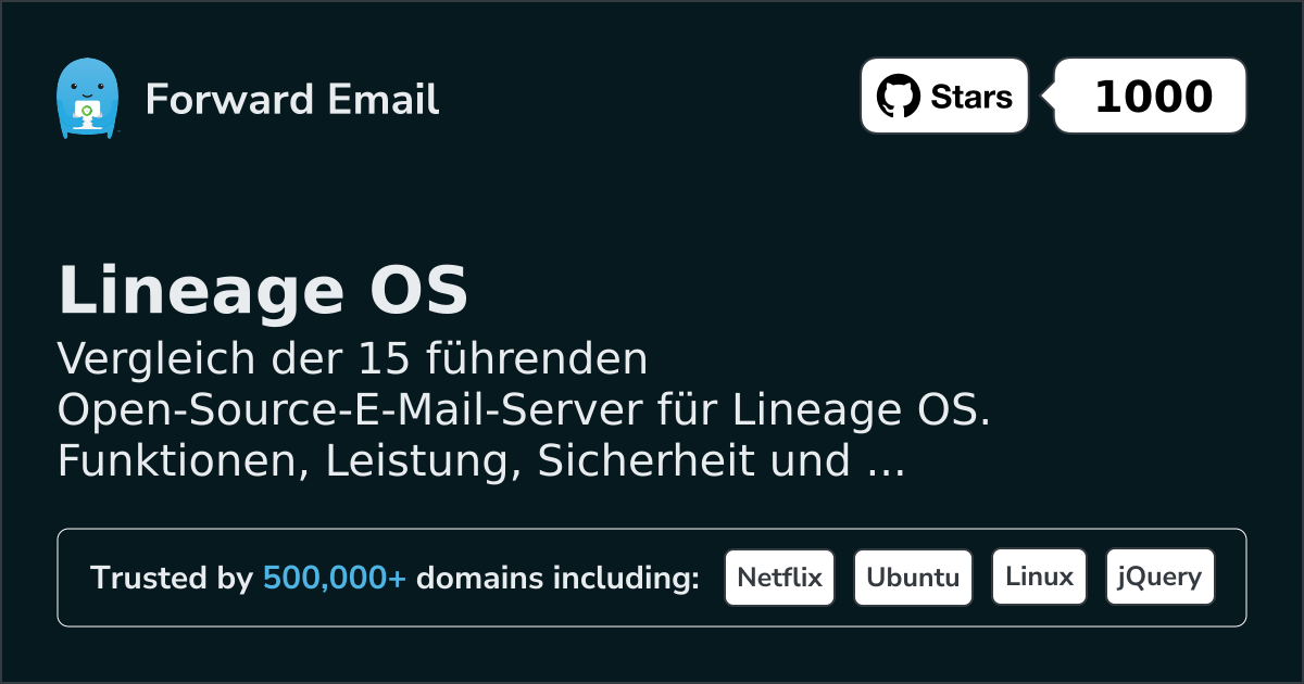 Forward Email ist eine Open-Source-E-Mail Server für Lineage OS. Die offizielle Beschreibung auf der Website lautet: „Datenschutzorientierte, verschlüsselte E-Mails für Sie. Wir sind der bevorzugte E-Mail-Dienst für Hunderttausende von Kreativen, Entwicklern und Unternehmen. Senden und empfangen Sie E-Mails als Sie@IhreDomain.com mit Ihrer benutzerdefinierten Domain oder verwenden Sie eine unserer Domains.“