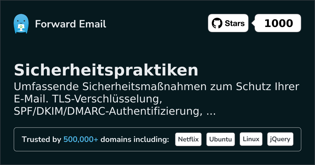 Für weitere Informationen zu unseren Sicherheitspraktiken oder um Sicherheitsbedenken zu melden, kontaktieren Sie bitte security@forwardemail.net.
