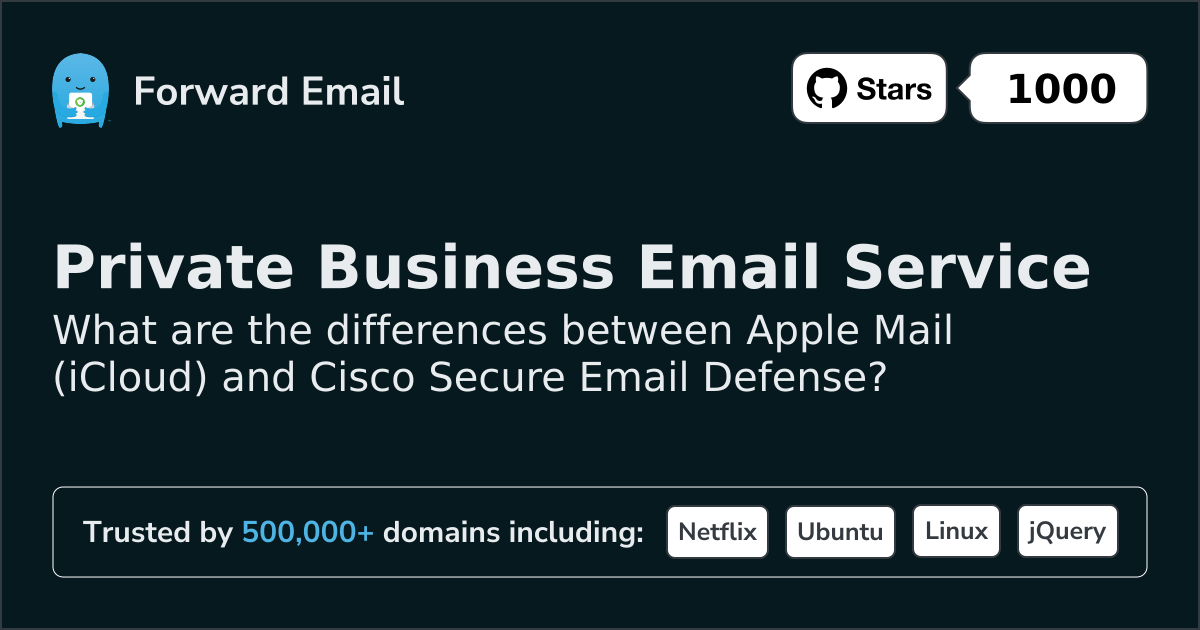 Apple Mail (iCloud)"Private, secure, and personal email from Apple" | vs. | Cisco Secure Email Defense"Advanced protection to safeguard your inboxes" |