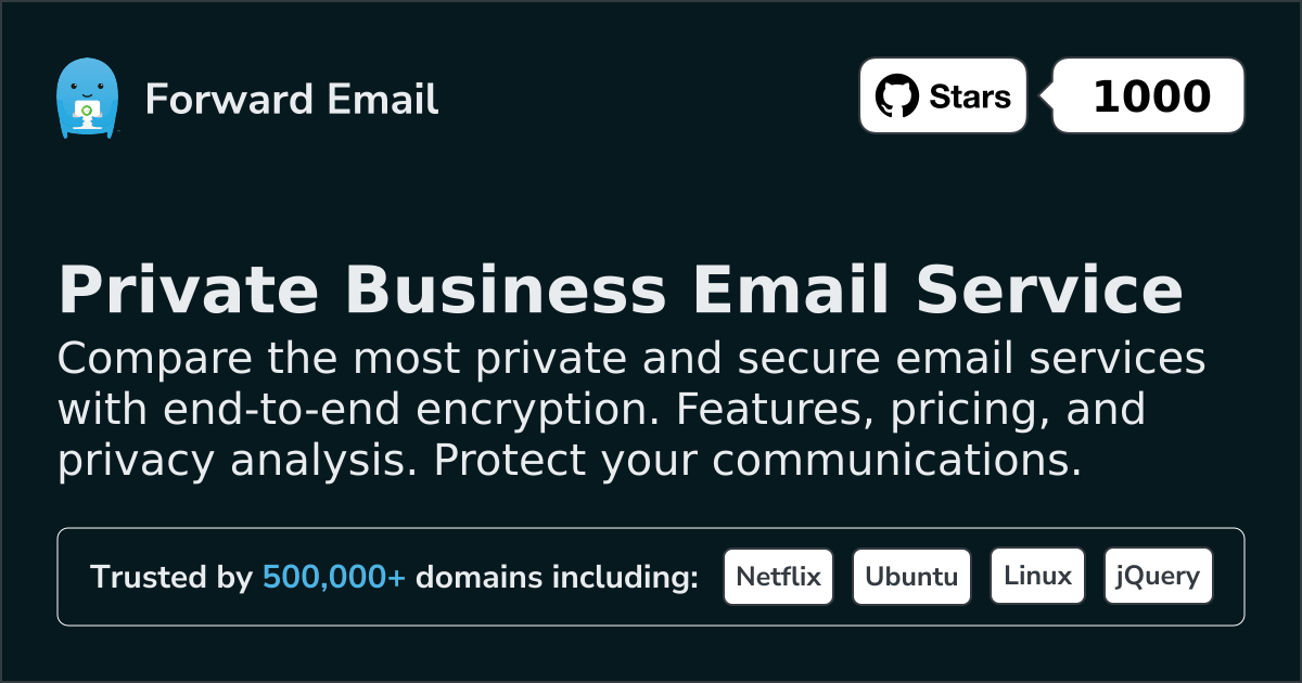 Forward Email⭐ RecommendedEmail for everyone | $3/mo | 10 GB pooled | 50 MB | Yes | Yes | Yes | Yes | TTI | Yes | Yes | Yes | Yes | ⚠️ Opt-in | Yes | Yes |