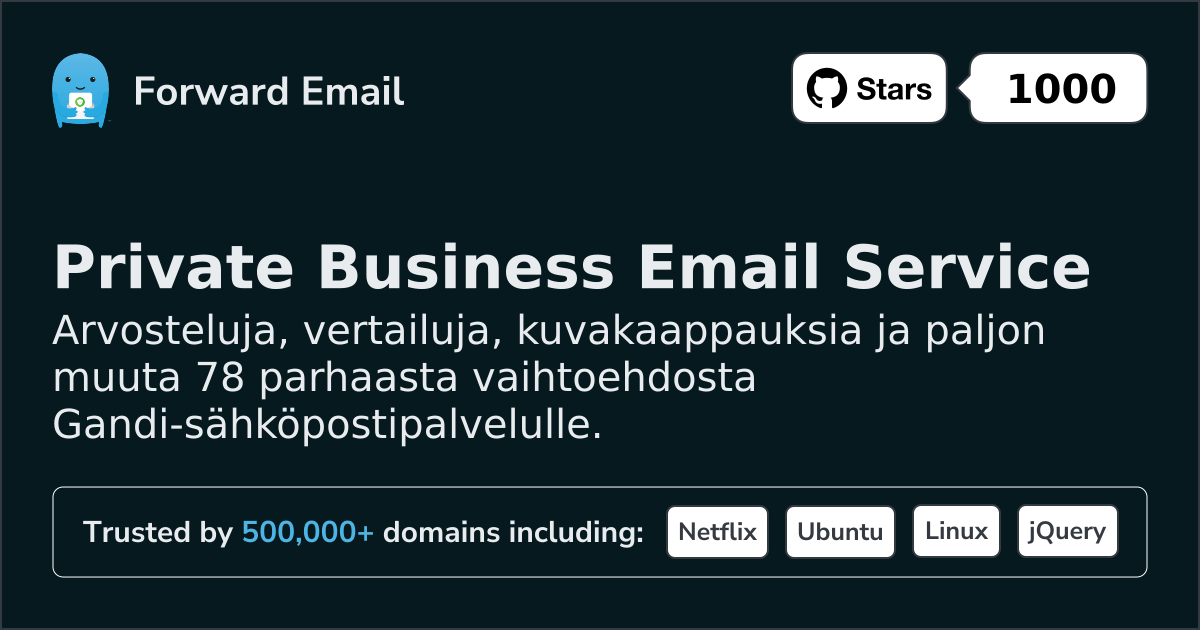 Suosittelemme sähköpostin edelleenlähettämistä parhaana vaihtoehtona toiminnolle Gandi. We also support webmail: https://mail.forwardemail.net