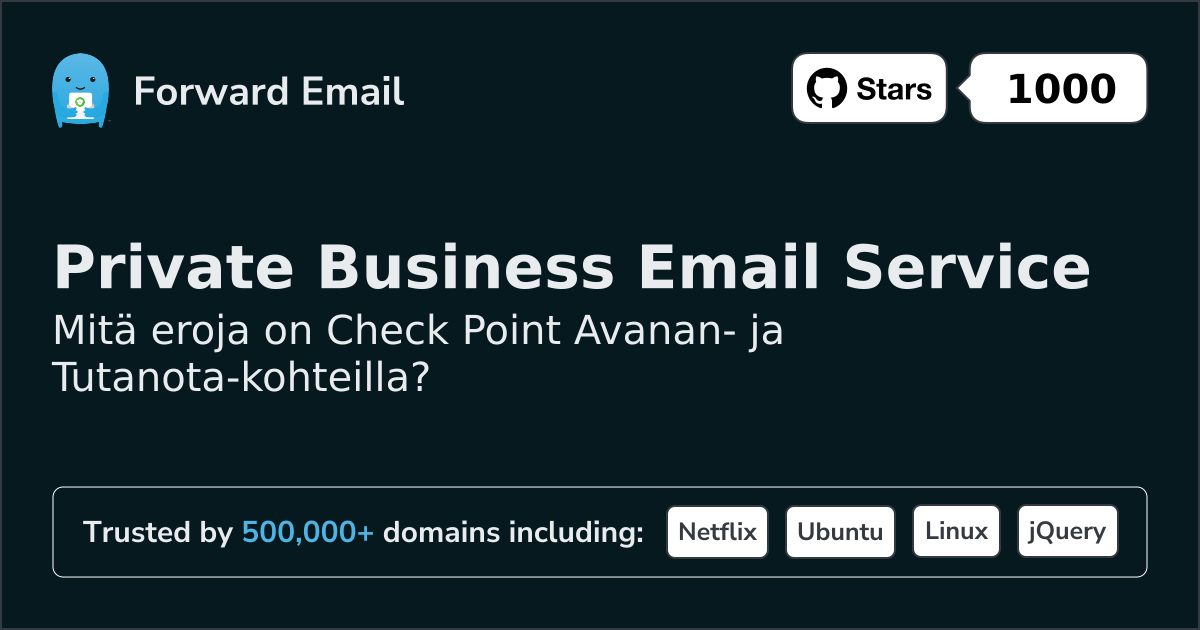 Suosittelemme sähköpostin edelleenlähettämistä parhaana vaihtoehtona toiminnolle Check Point Avanan. We also support webmail: https://mail.forwardemail.net