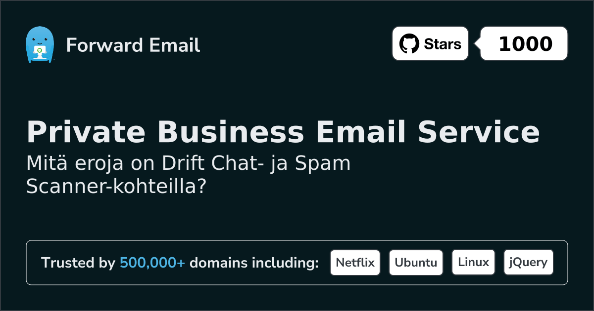 Suosittelemme sähköpostin edelleenlähettämistä parhaana vaihtoehtona toiminnolle Drift Chat. We also support webmail: https://mail.forwardemail.net