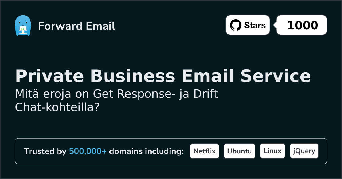 Suosittelemme sähköpostin edelleenlähettämistä parhaana vaihtoehtona toiminnolle Get Response. We also support webmail: https://mail.forwardemail.net