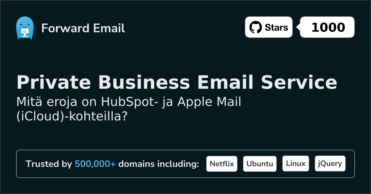Suosittelemme sähköpostin edelleenlähettämistä parhaana vaihtoehtona toiminnolle HubSpot. We also support webmail: https://mail.forwardemail.net
