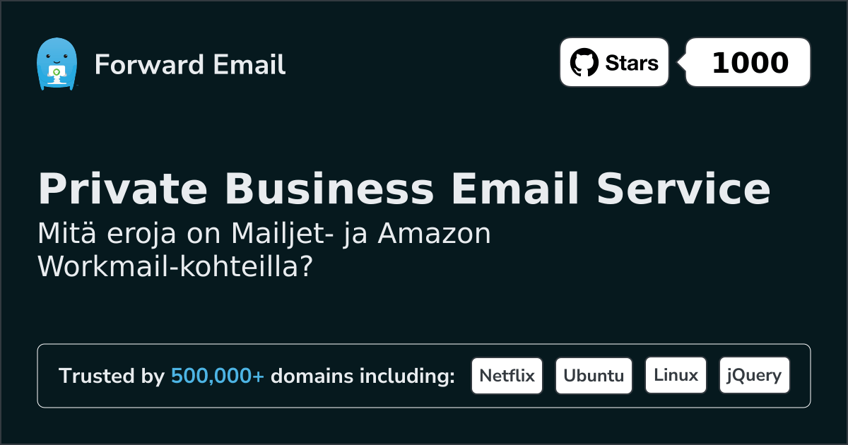 Suosittelemme sähköpostin edelleenlähettämistä parhaana vaihtoehtona toiminnolle Mailjet. We also support webmail: https://mail.forwardemail.net