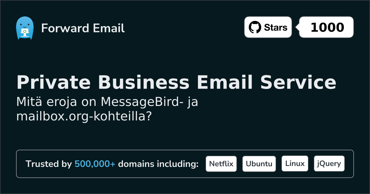 Suosittelemme sähköpostin edelleenlähettämistä parhaana vaihtoehtona toiminnolle MessageBird. We also support webmail: https://mail.forwardemail.net