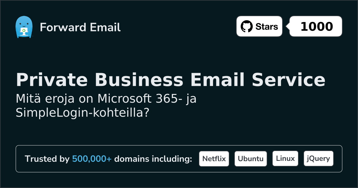 Suosittelemme sähköpostin edelleenlähettämistä parhaana vaihtoehtona toiminnolle Microsoft 365. We also support webmail: https://mail.forwardemail.net