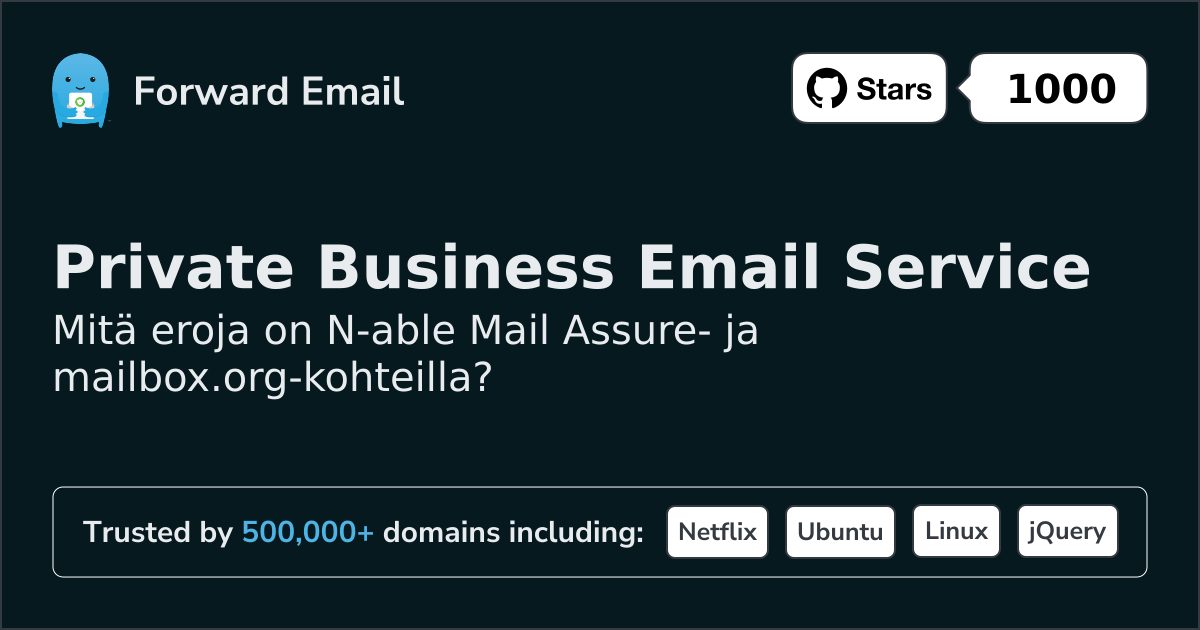 Suosittelemme sähköpostin edelleenlähettämistä parhaana vaihtoehtona toiminnolle N‑able Mail Assure. We also support webmail: https://mail.forwardemail.net