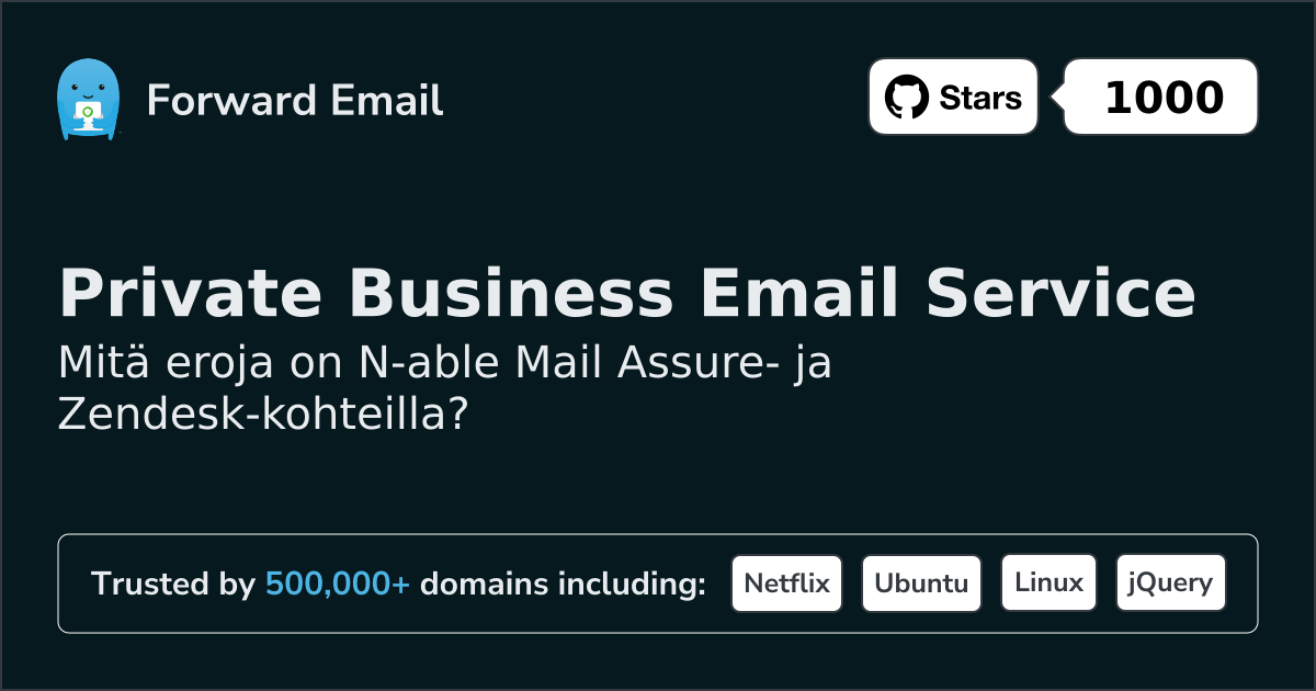 Suosittelemme sähköpostin edelleenlähettämistä parhaana vaihtoehtona toiminnolle N‑able Mail Assure. We also support webmail: https://mail.forwardemail.net