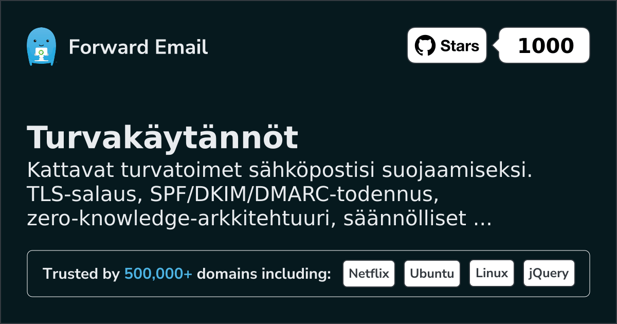 Lisätietoja turvallisuuskäytännöistämme tai turvallisuushuolien raportoinnista saa ottamalla yhteyttä osoitteeseen security@forwardemail.net.