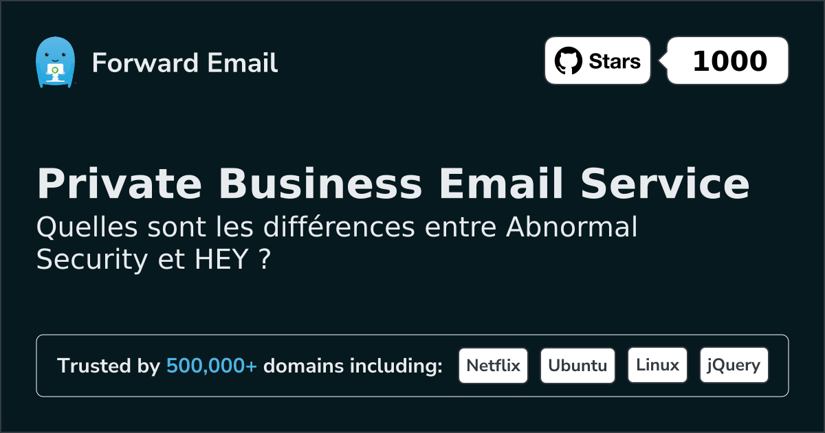 Nous recommandons Transférer un e-mail comme la meilleure alternative à Abnormal Security. We also support webmail: https://mail.forwardemail.net