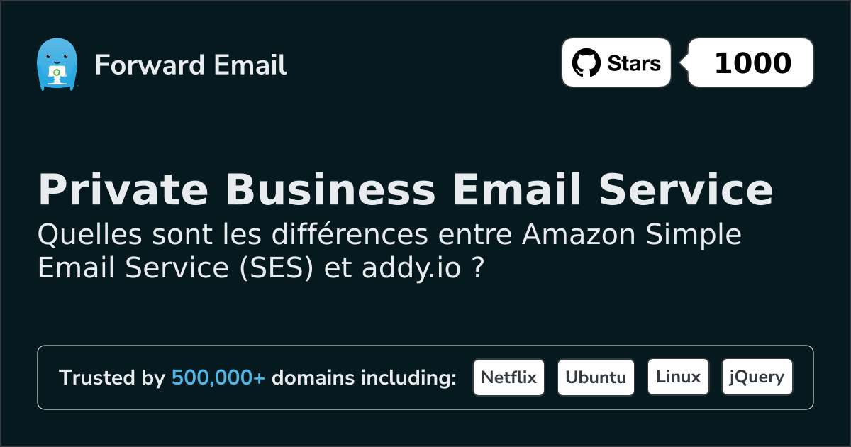 Nous recommandons Transférer un e-mail comme la meilleure alternative à Amazon Simple Email Service (SES). We also support webmail: https://mail.forwardemail.net