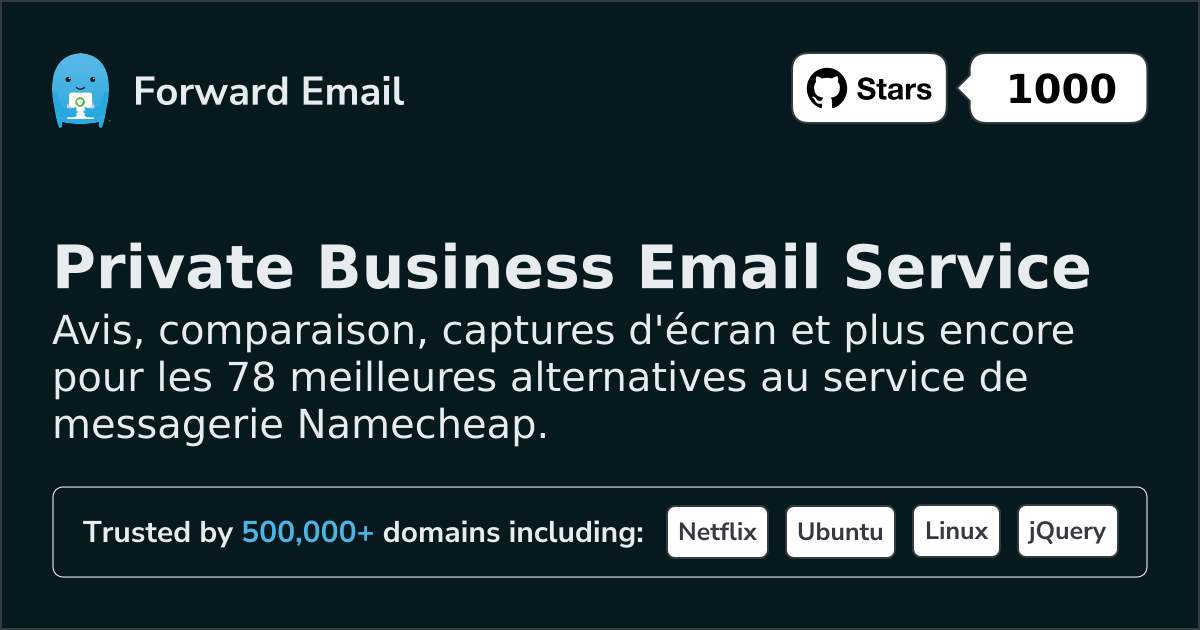 Nous recommandons Transférer un e-mail comme la meilleure alternative à Namecheap. We also support webmail: https://mail.forwardemail.net