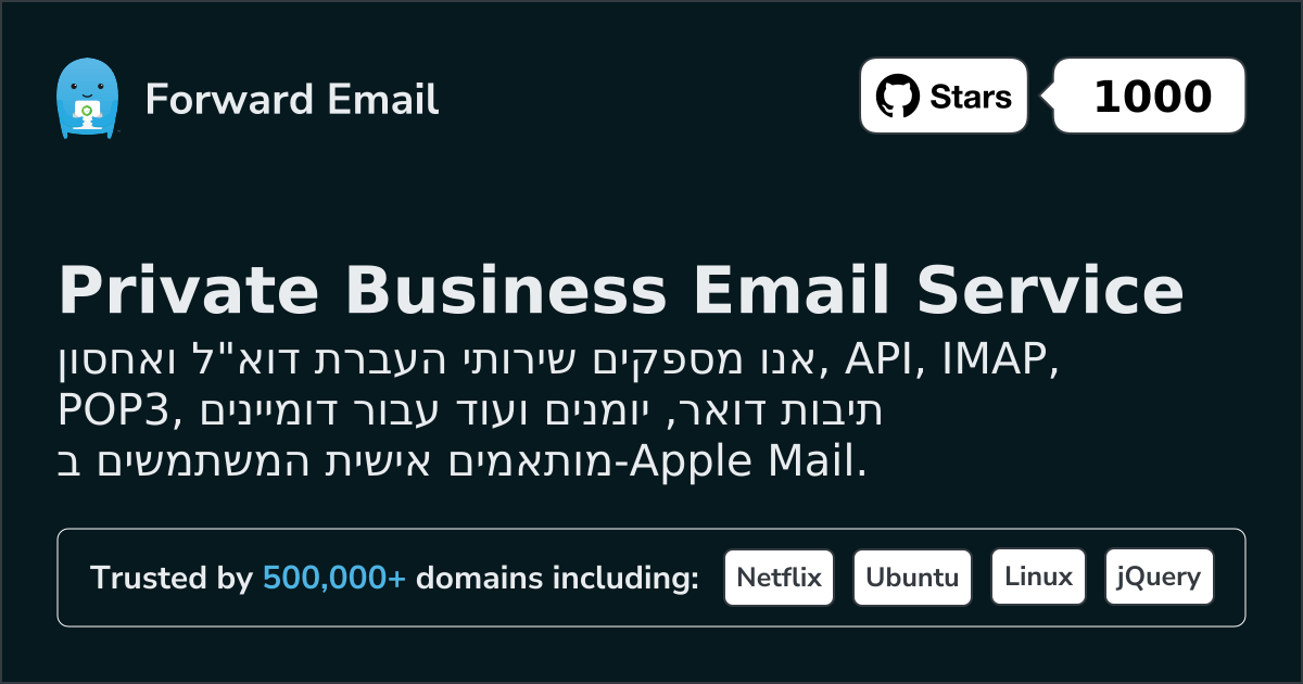 אנו מספקים שירותי העברת דוא"ל ואחסון, API, IMAP, POP3, תיבות דואר, יומנים ועוד עבור דומיינים מותאמים אישית המשתמשים ב-Apple Mail.