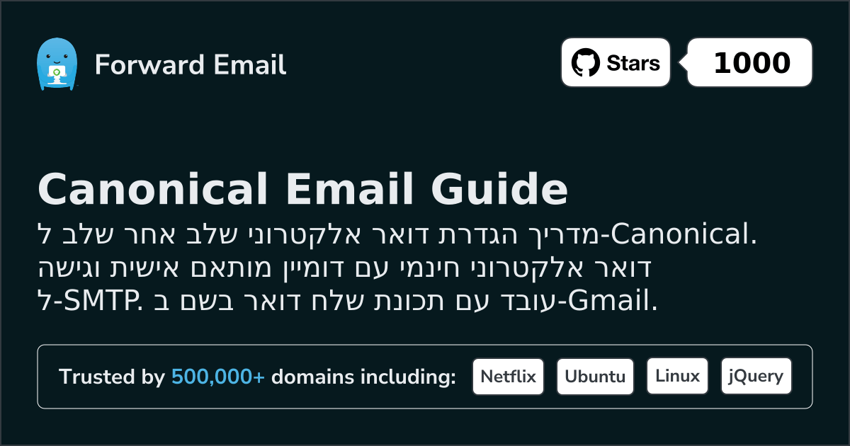 מדריך הגדרת דואר אלקטרוני שלב אחר שלב ל-Canonical. דואר אלקטרוני חינמי עם דומיין מותאם אישית וגישה ל-SMTP. עובד עם תכונת שלח דואר בשם ב-Gmail.