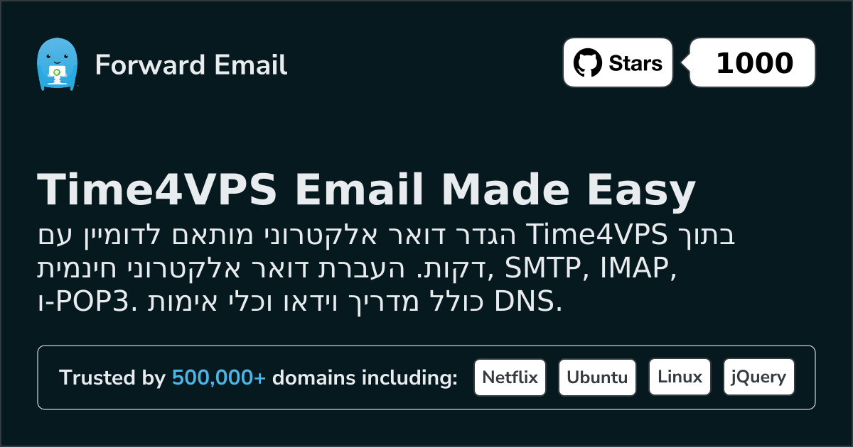הגדר דואר אלקטרוני מותאם לדומיין עם Time4VPS בתוך דקות. העברת דואר אלקטרוני חינמית, SMTP, IMAP, ו-POP3. כולל מדריך וידאו וכלי אימות DNS.