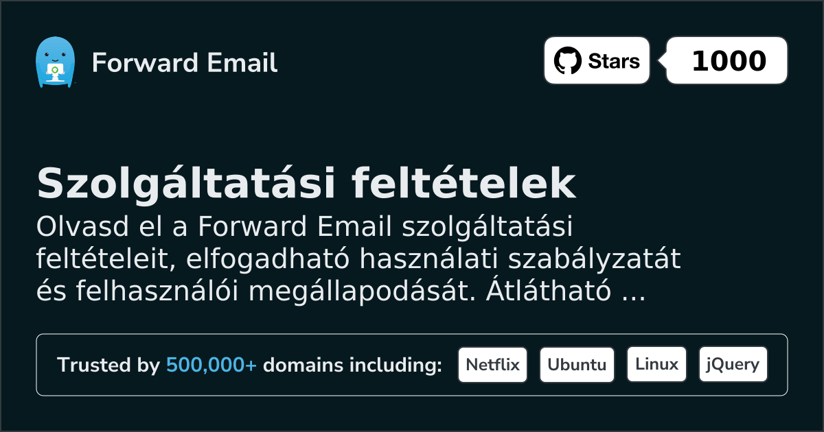 A Forward Email nem vizsgálta felül az összes, a Szolgáltatásához kapcsolódó webhelyet, és nem vállal felelősséget ezen kapcsolt webhelyek tartalmáért. Bármely hivatkozás szerepeltetése nem jelenti a Forward Email jóváhagyását az adott webhelyre. Az ilyen kapcsolt webhely használata a felhasználó saját felelősségére történik.