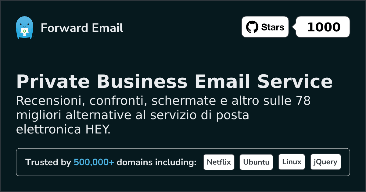 Forward Email⭐ I più votatiEmail per tutti | $3/mo | 10 GB pooled | 50 MB | SÌ | SÌ | SÌ | SÌ | TTI | SÌ | SÌ | SÌ | SÌ | ⚠️ Opt-in | SÌ | SÌ |