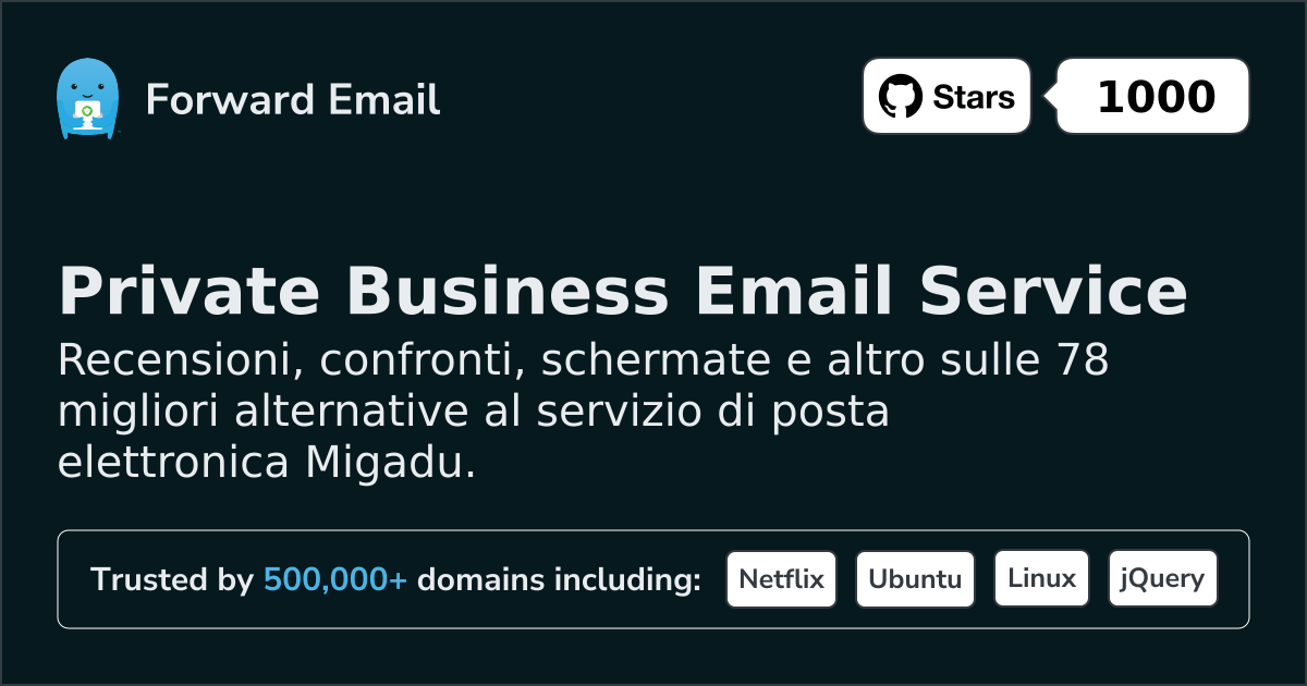 Forward Email⭐ PreferitoEmail per tutti | $3/mo | 10 GB pooled | 50 MB | SÌ | SÌ | SÌ | SÌ | TTI | SÌ | SÌ | SÌ | SÌ | ⚠️ Opt-in | SÌ | SÌ |