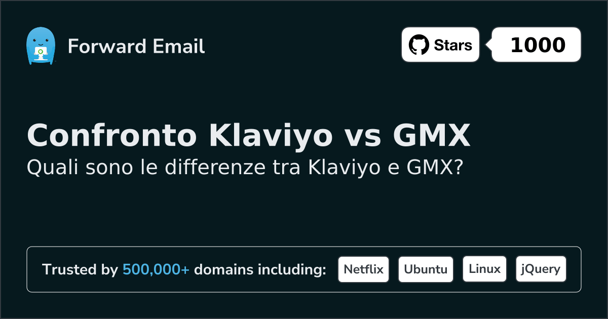 Klaviyo"Potenzia relazioni digitali più intelligenti" | contro | GMX"Crea rapidamente un account email gratuito" |