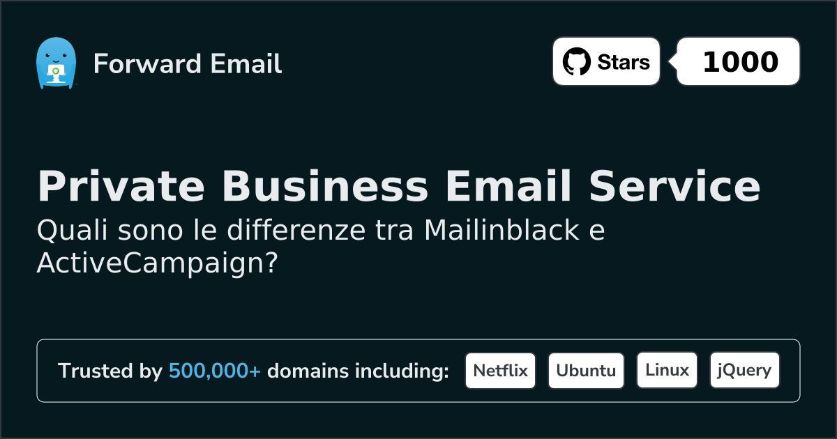 Mailinblack"La tua sicurezza informatica è il nostro lavoro" | contro | ActiveCampaign"Postmark, il servizio leader per le e-mail transazionali, ora fa parte di ActiveCampaign" |