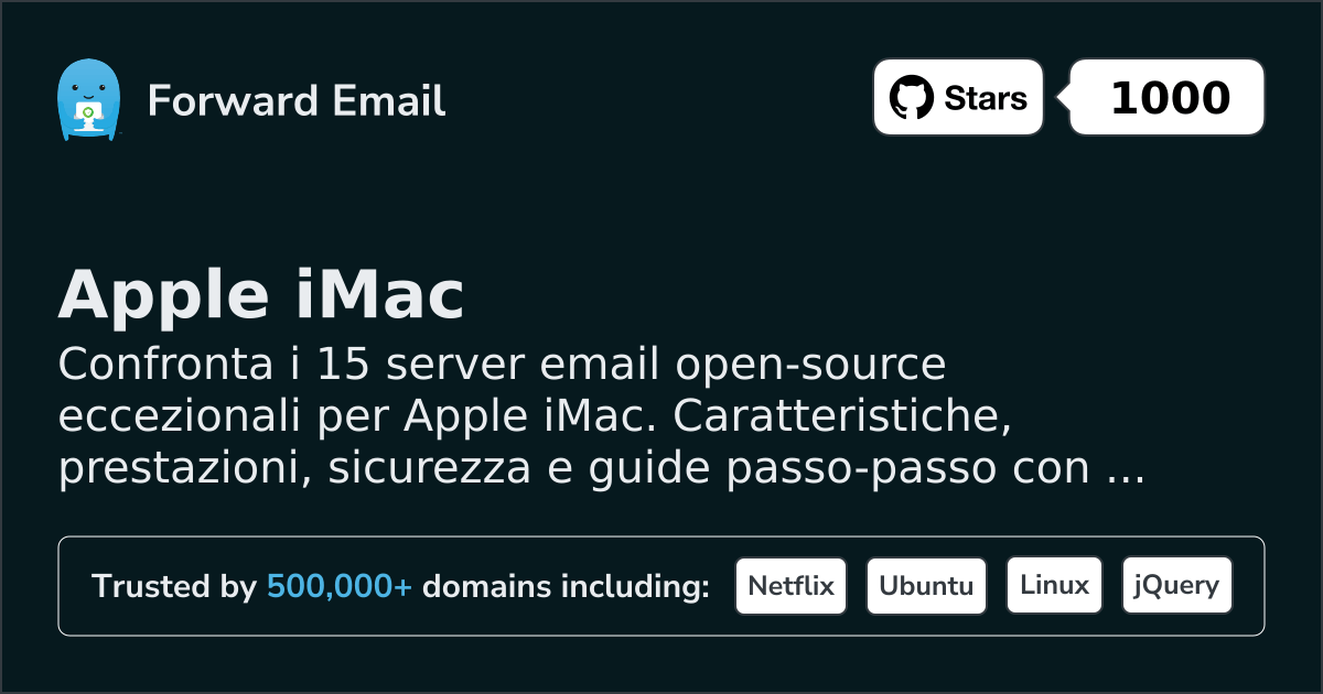 Confronta i 15 server email open-source eccezionali per Apple iMac. Caratteristiche, prestazioni, sicurezza e guide passo-passo con screenshot.