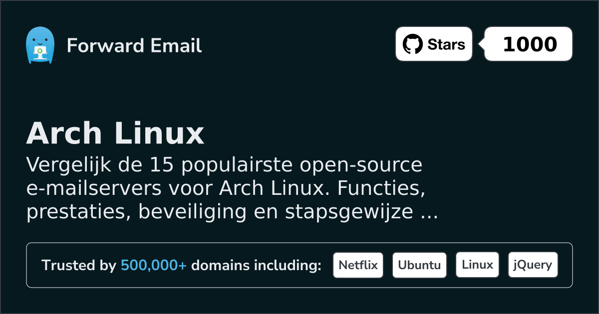 Vergelijk de 15 populairste open-source e-mailservers voor Arch Linux. Functies, prestaties, beveiliging en stapsgewijze installatiehandleidingen met screenshots.