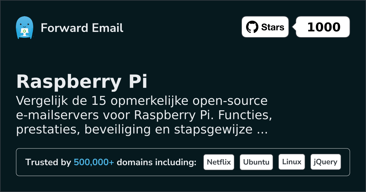 Forward Email is een open-source e-mail server voor Raspberry Pi. De officiële beschrijving op de website luidt: "Versleutelde e-mail met privacy voor jou. Wij zijn dé e-mailservice voor honderdduizenden makers, ontwikkelaars en bedrijven. Verstuur en ontvang e-mail onder jouw domeinnaam, zoals jij@jouwdomein.com, met je eigen domein of gebruik een van onze domeinen."