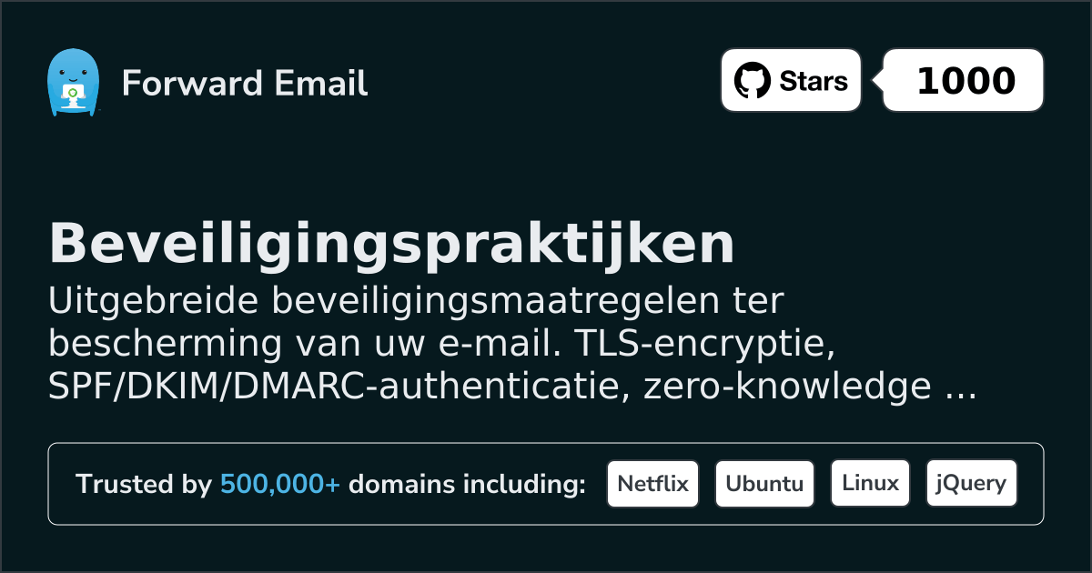 Voor meer informatie over onze beveiligingspraktijken of om beveiligingsproblemen te melden, neem contact op met security@forwardemail.net.