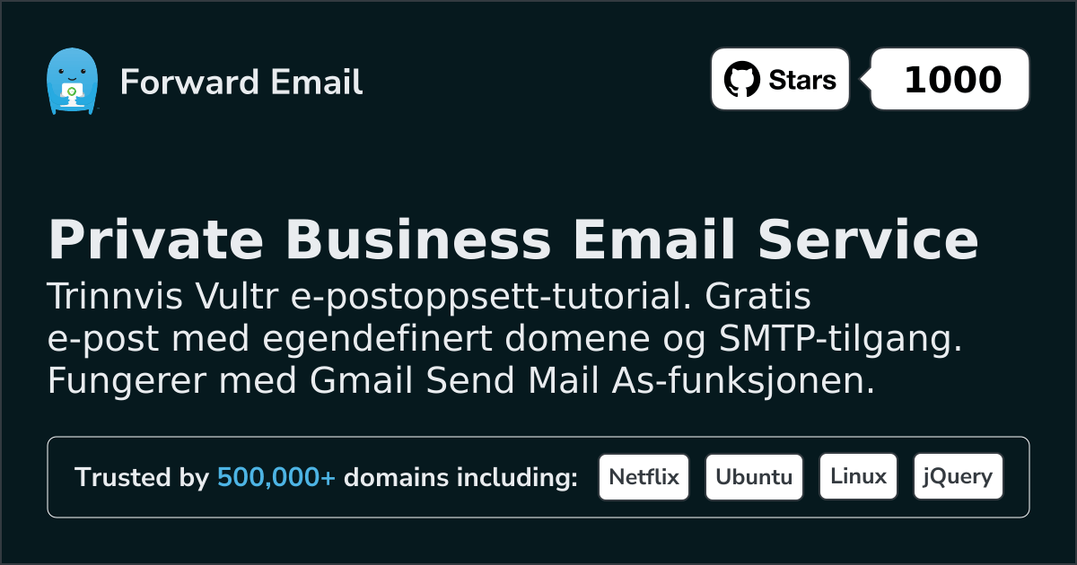 Trinnvis Vultr e-postoppsett-tutorial. Gratis e-post med egendefinert domene og SMTP-tilgang. Fungerer med Gmail Send Mail As-funksjonen.