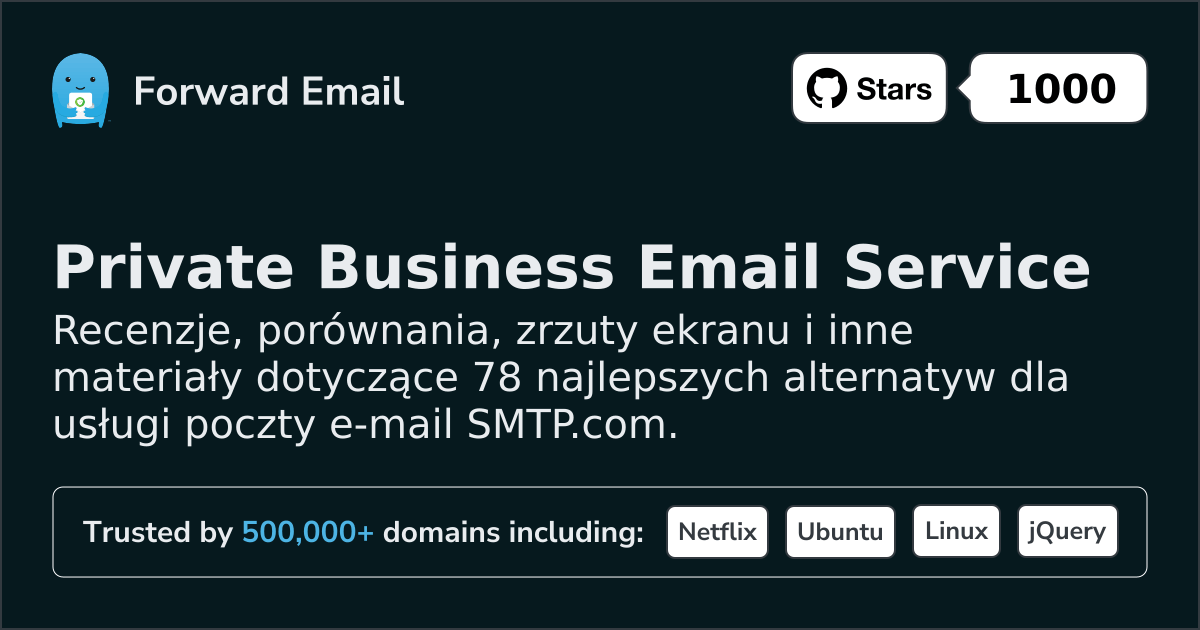 Zalecamy Przekaż dalej wiadomość e-mail jako najlepszą alternatywę dla SMTP.com. We also support webmail: https://mail.forwardemail.net