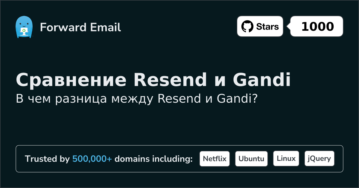 Resend"Электронная почта для разработчиков" | против. | Gandi"На наших почтовых серверах мы управляем более чем 780 000 адресов электронной почты. Почему бы не сделать то же самое с вашими?" |