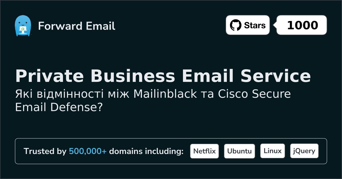 Mailinblack"Ваша кібербезпека – наша робота" | проти | Cisco Secure Email Defense"Розширений захист для безпеки ваших поштових скриньок" |