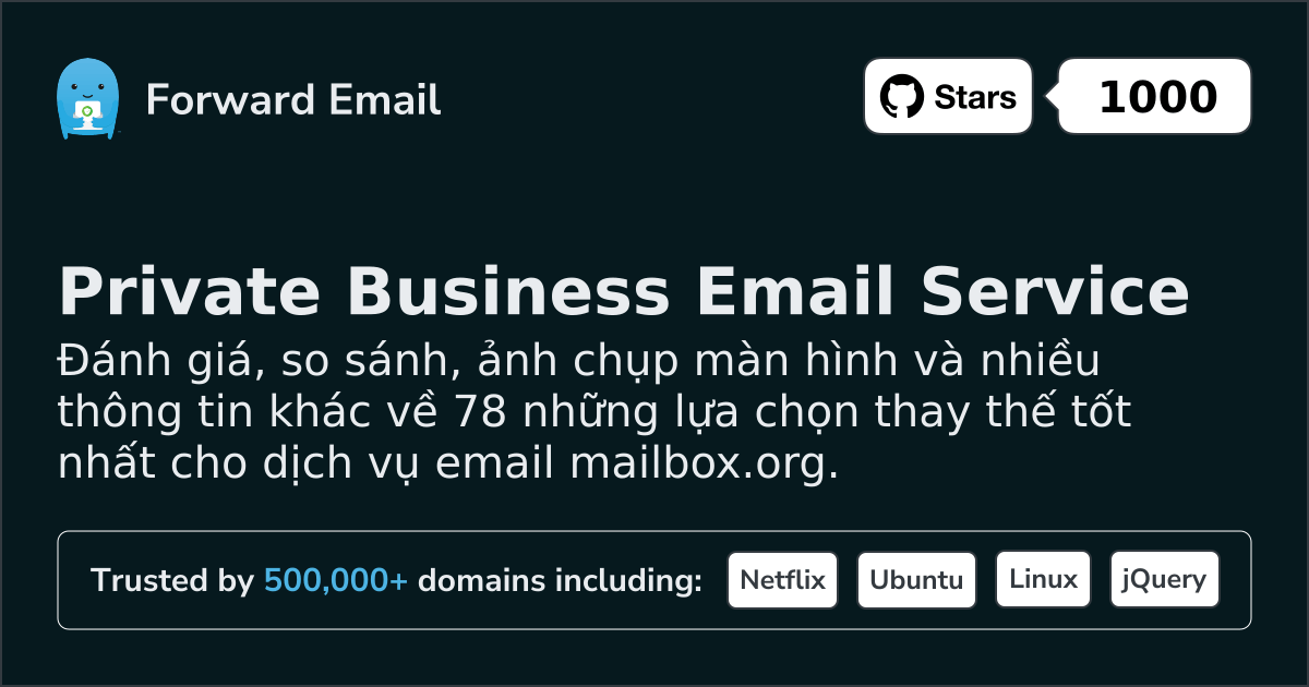 Forward Email⭐ Đề xuấtEmail cho mọi người | $3/mo | 10 GB pooled | 50 MB | Đúng | Đúng | Đúng | Đúng | TTI | Đúng | Đúng | Đúng | Đúng | ⚠️ Opt-in | Đúng | Đúng |