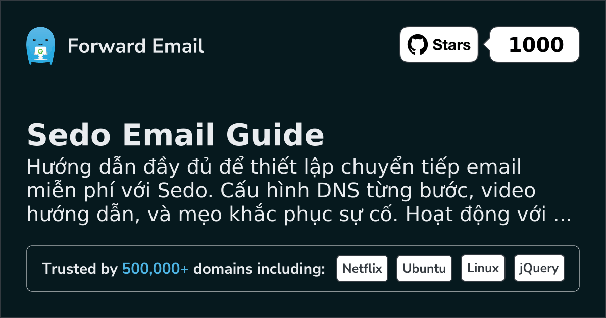 Hướng dẫn đầy đủ để thiết lập chuyển tiếp email miễn phí với Sedo. Cấu hình DNS từng bước, video hướng dẫn, và mẹo khắc phục sự cố. Hoạt động với Gmail, Outlook, và tất cả ứng dụng email.